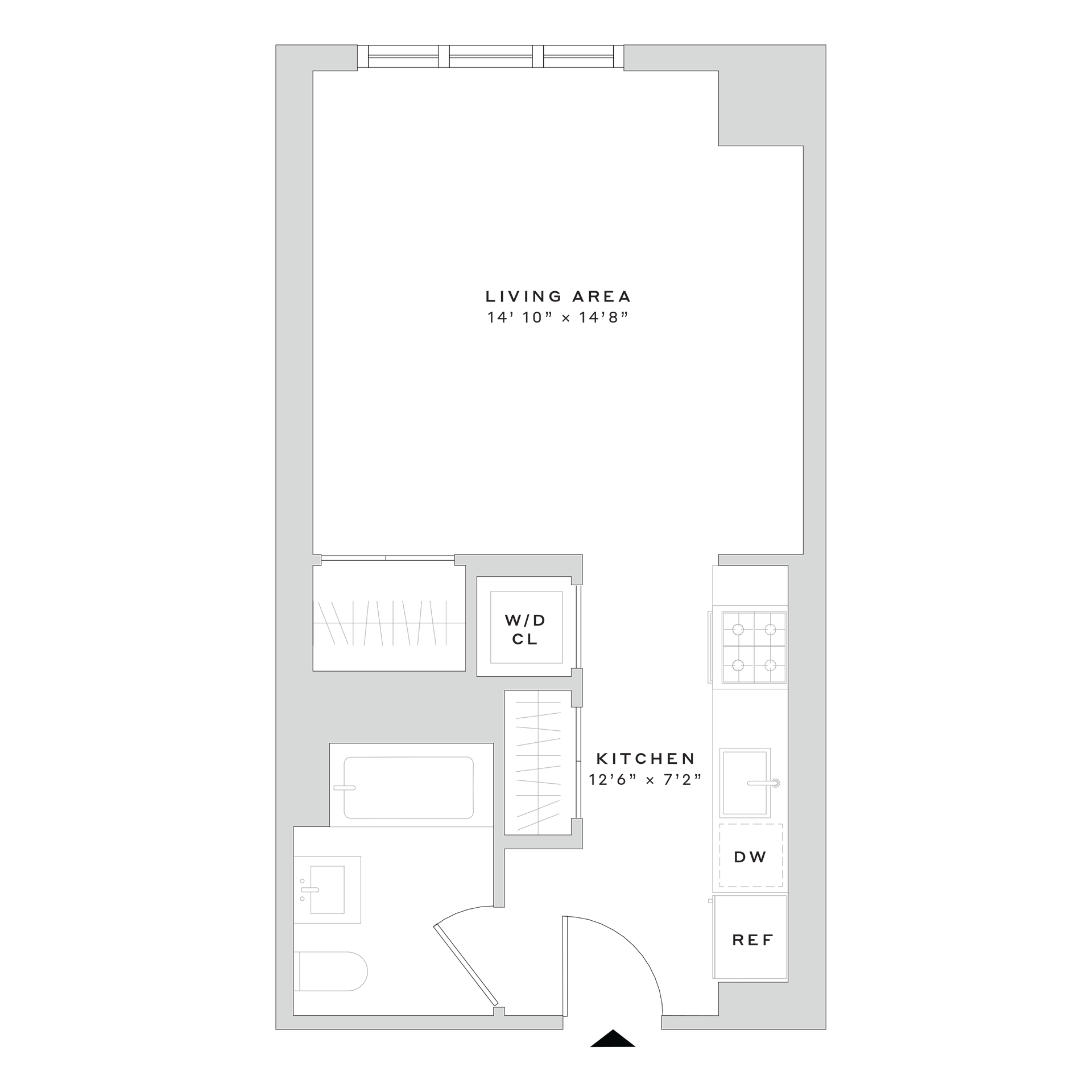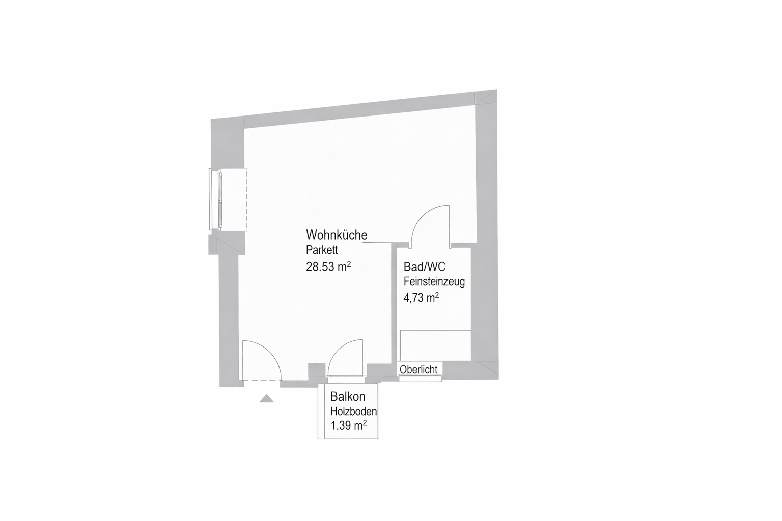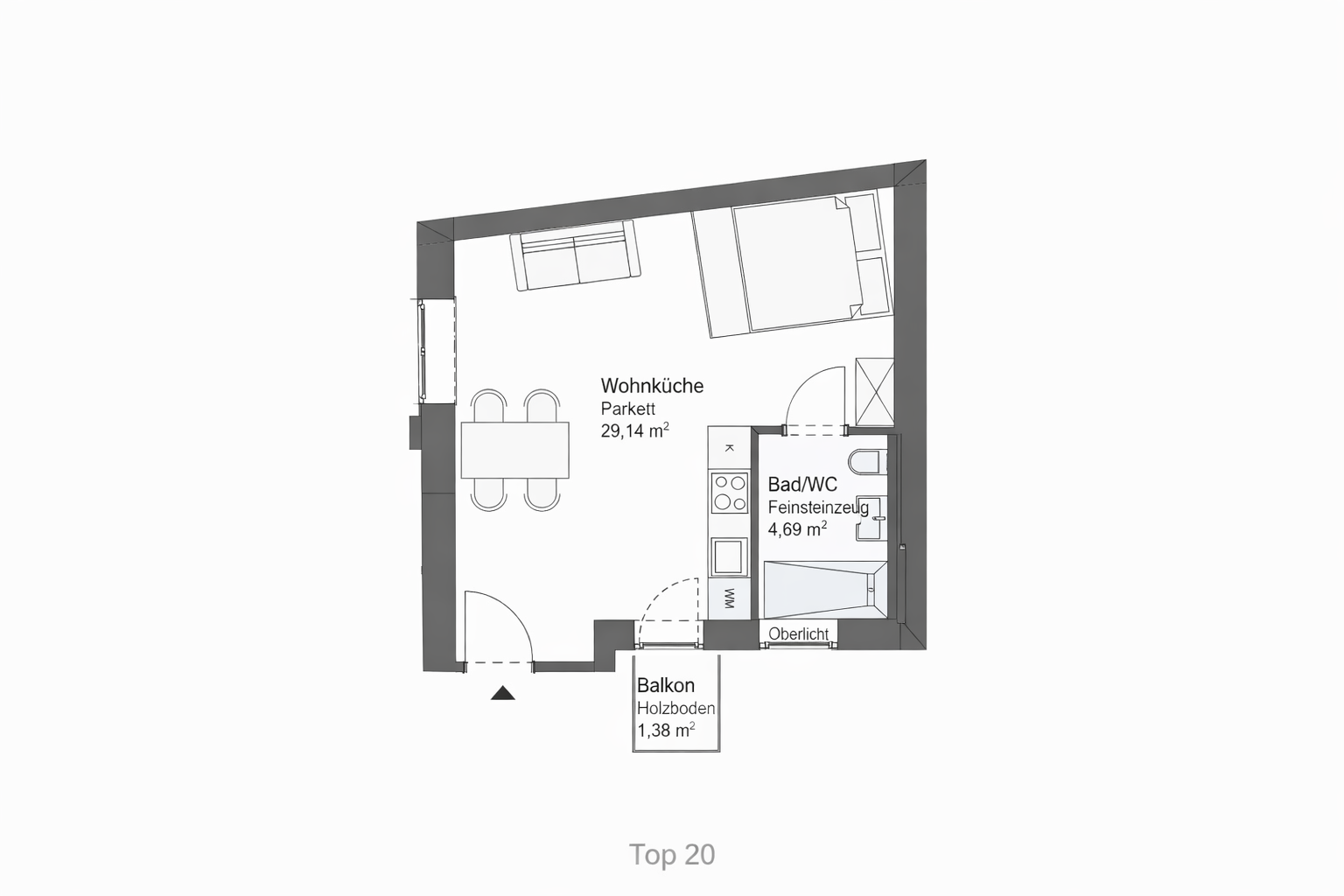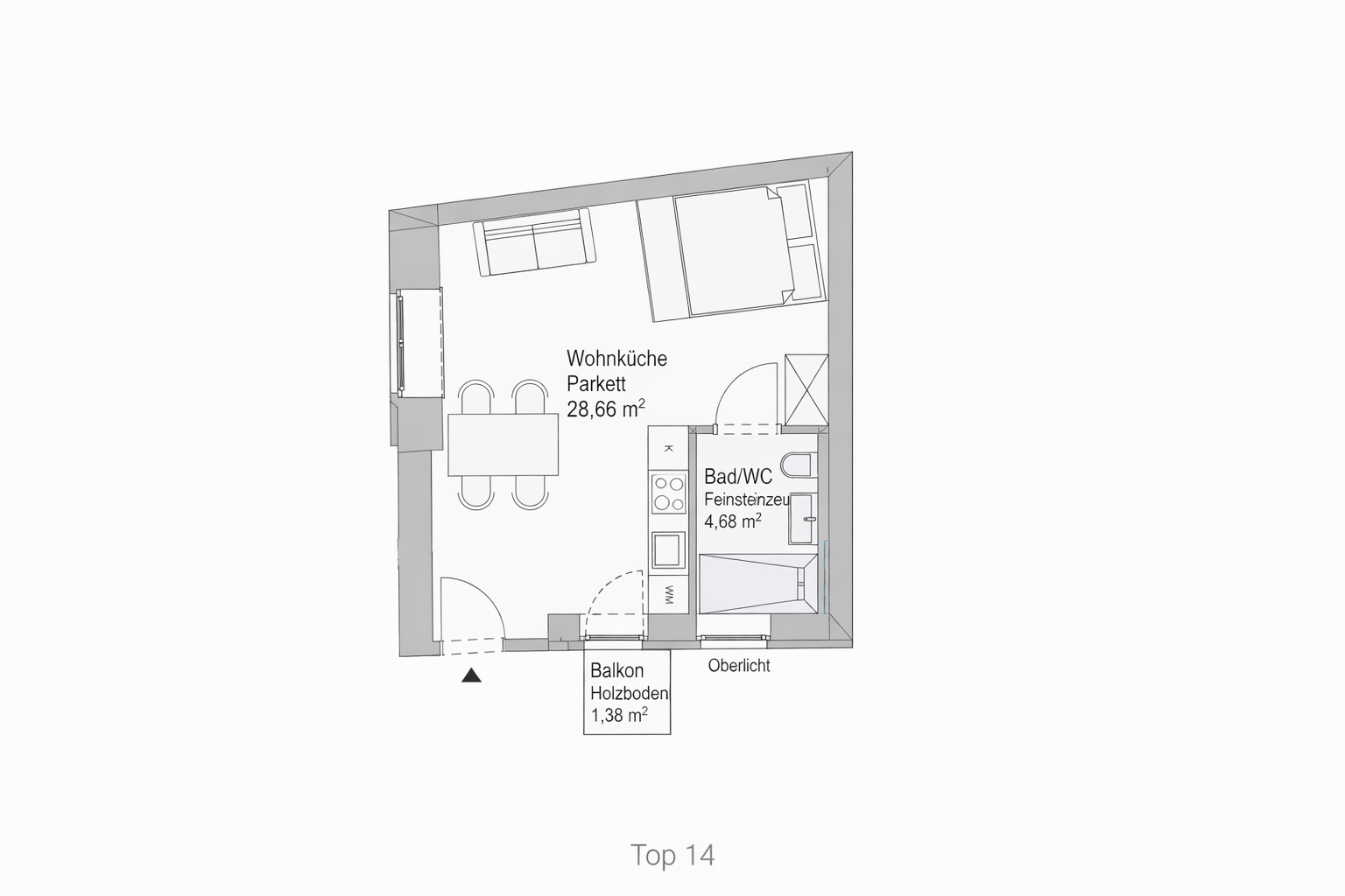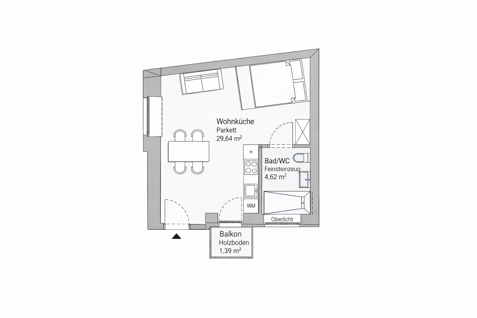 Der 1-Zimmer-Grundriss zeigt eine kompakte Wohnung mit offenem Wohn- und Schlafbereich, integrierter Küchenzeile sowie einem separaten Bad/WC und kleinem Vorraum. Ergänzt wird die Einheit durch einen Balkon bzw. eine Terrasse, die direkt vom Wohnbereich zugänglich ist und zusätzlichen Außenraum bietet.