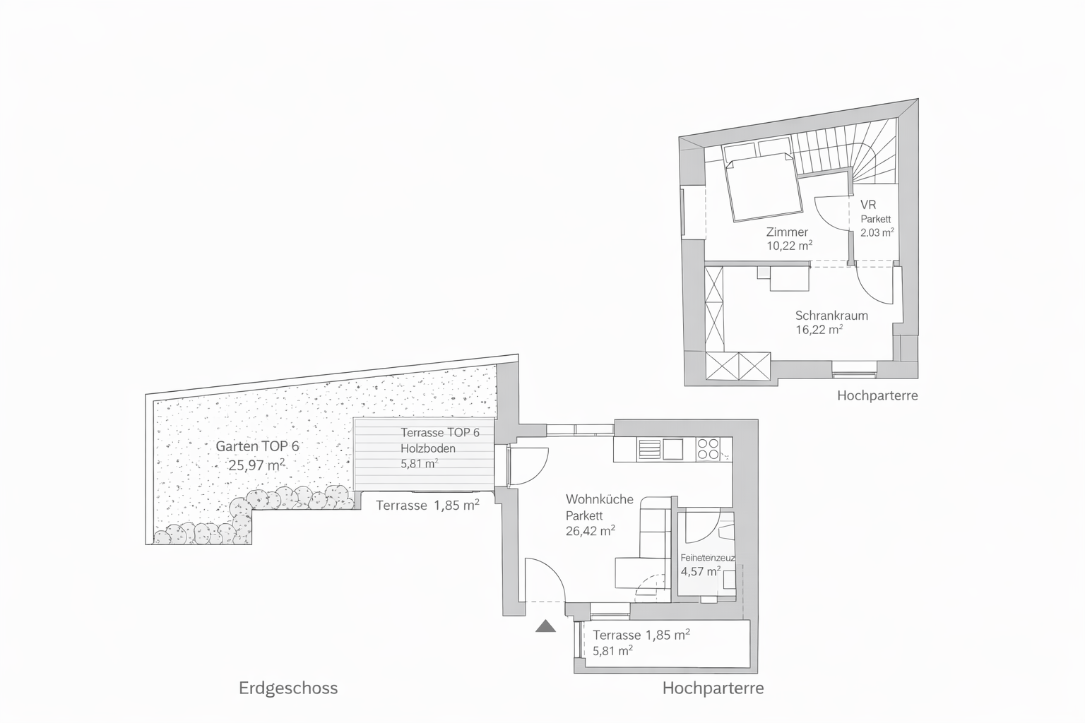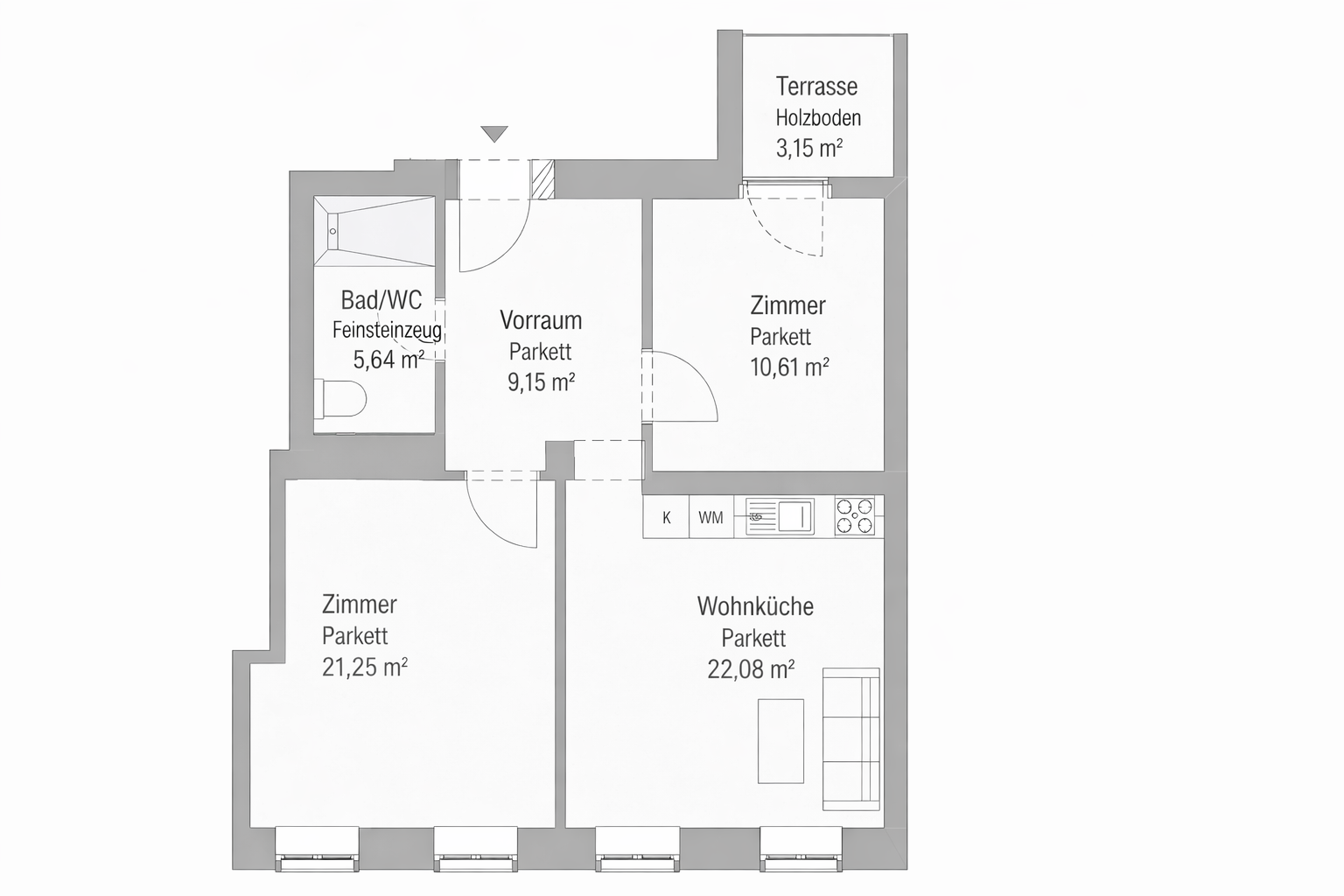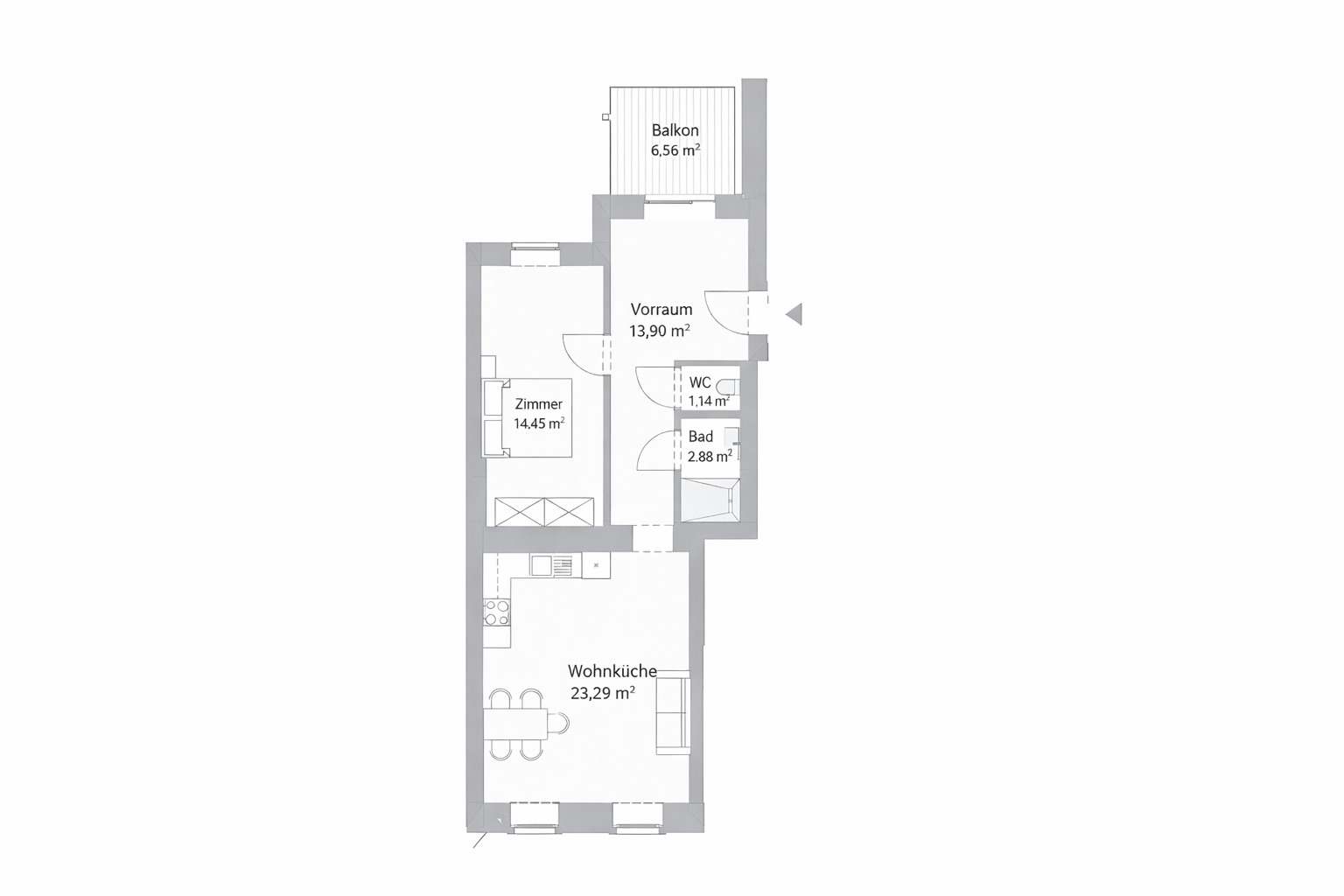 Der 2-Zimmer-Grundriss verfügt über ein separates Schlafzimmer sowie einen großzügigen Wohn- und Essbereich mit integrierter Küche, der als zentraler Aufenthaltsraum dient. Ergänzt wird die Wohnung durch einen Vorraum, ein Bad mit WC und einen Balkon bzw. eine Terrasse, die zusätzlichen Außenraum bietet.