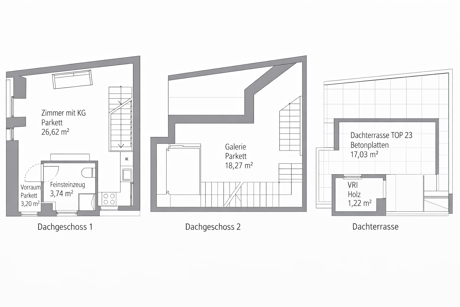 Der Dachgeschoss-Grundriss erstreckt sich über zwei Ebenen mit einem offenen Wohnbereich im unteren Geschoss und einer Galerie im oberen Bereich. Abgerundet wird die Wohnung durch eine großzügige Dachterrasse, die direkt vom oberen Geschoss aus zugänglich ist und einen attraktiven Außenbereich bietet.